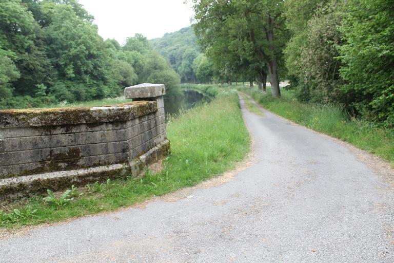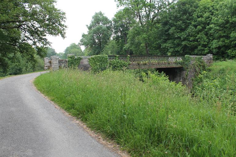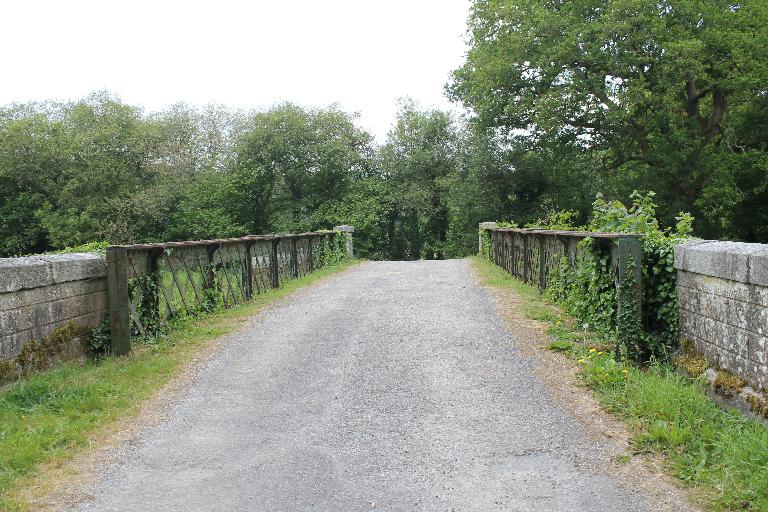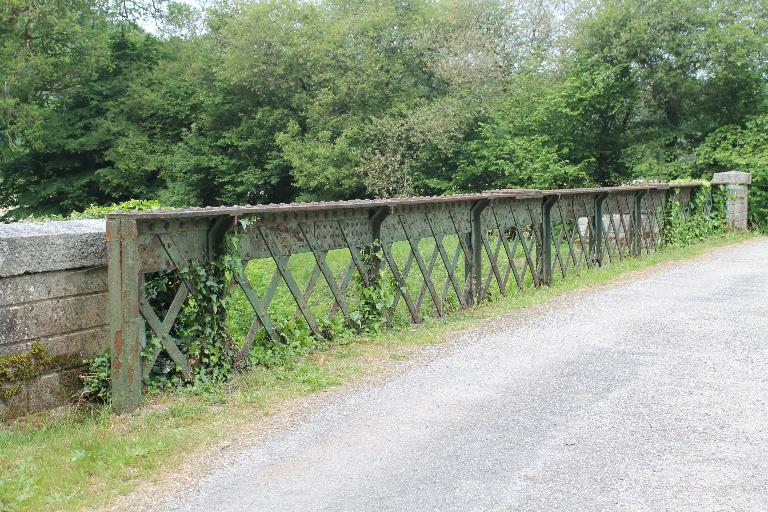 Passerelle sur le canal à 100 m en aval de l'écluse ; culées : moellons de schiste, tablier : poutrelles métalliques et voûtains de brique, revêtement goudron, garde-corps métallique et avant-corps maçonné en ciment et granite en pierre de taille.