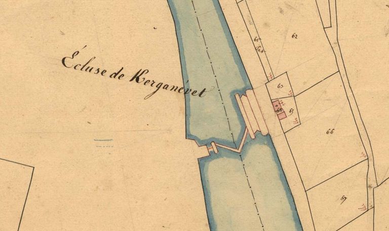Écluse à sas ; moyen appareil de schiste, parements supérieurs & chaînes d'angle : pierre de taille de granite ; pare-gravier : moellons de schiste, parements supérieurs : dalles de schiste ; bittes d´amarrage ; six organeaux dans le sas. État actuel : fuites en amont du sas, portes métalliques. Déversoir & vanne au niveau de la porte amont. Déversoir en éperon : pierre de taille de granite. Vanne contre la rive opposée à l'écluse ; îlot et culée : pierre de taille de granite. État actuel : vanne et échelle métalliques récentes. Borne kilométrique. Le granite utilisé dans ce site provient du Huelgoat (Chauris).