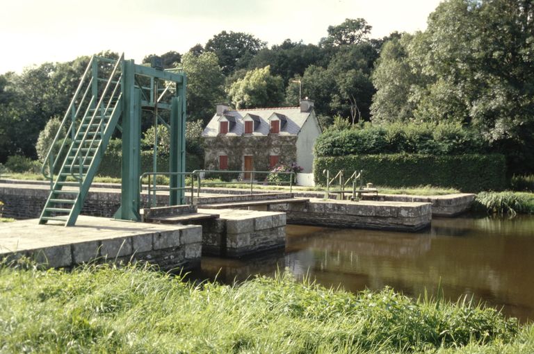 Écluse à sas ; moellons de schiste, parements supérieurs : dalles de schiste et granite, chaînes d'angle : pierre de taille de granite ; musoirs à angles droits en amont, arrondis en aval ; bittes d´amarrage. État actuel : portes, passerelle et vanne récentes ; bajoyer de rive renforcé en amont par des éléments de béton ; un vide en L dans le sas (?). Déversoir & vanne au niveau de la porte amont. Déversoir rectiligne. État actuel : passerelle de béton récente, garde-corps métallique. Vanne : îlot et culée en moellon de schiste, parements supérieurs : pierre de taille de granite. État actuel : vanne récente, culée soutenue par un puissant massif de maçonnerie, échelle de métal sur maçonnerie. Perré face au bajoyer de large : moellons de schiste. Bief amont, la rigole de ceinture, à droite du chemin de halage, prend la forme d'un petit étang. Le granite utilisé dans ce site provient du Huelgoat (Chauris).