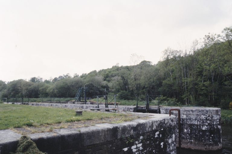 Écluse à sas ; moyen appareil de schiste, parements supérieurs & chaînes d'angle : grand appareil de granite et de schiste ; bittes d'amarrage. État actuel : fuites en amont du sas, portes métalliques. Déversoir & vanne au niveau de la porte amont. Déversoir rectiligne. État actuel : passerelle récente : béton, garde-corps métallique. Vanne, état actuel : vanne et échelle métalliques récentes. Ponceaux de halage de part et d'autre de l'écluse, rive droite, sur une dérivation alimentant une ancienne fabrique en ruines ; vestige de roues métalliques à courroies. Le granite utilisé dans ce site provient du Huelgoat (Chauris).