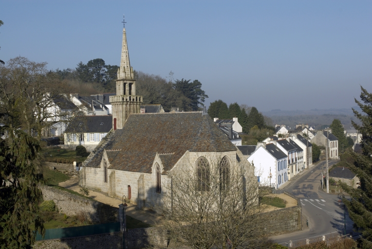 La chapelle, placée dans un enclos avec calvaire à l´entrée sud du bourg, a été construite, à l'exception de la flèche, au début du 16e siècle, à l'initiative des familles du Vieux Chastel, seigneurs du Rusquec (Loqueffret) et de Kerannou (Brennilis). Les armoiries d'autres familles apparentées (Quélen, Quimerc´h, Kergorlay, Rostrenen, Coëtmen) figurent sur les verrières de la première moitié 16e siècle ainsi que certaines sablières. La sablière sud de la nef porte la date de 1580. Des travaux de restauration interviennent en 1832 et 1865 ; la mise en place de la chambre des cloches et de la flèche semble remonter à cette époque. La restauration extérieure et la réfection des sablières a eu lieu en 2005.