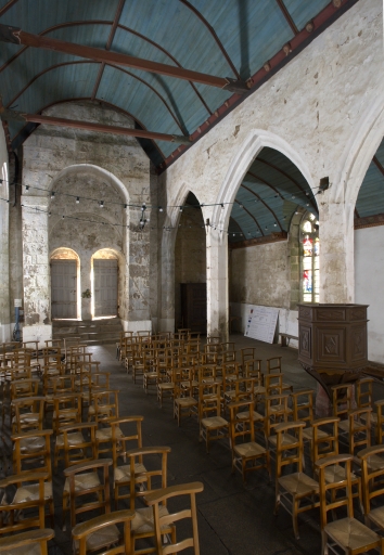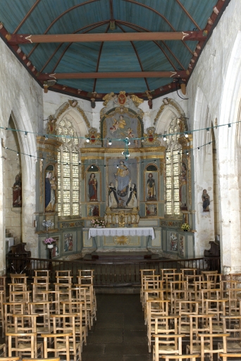 Edifice de plan rectangulaire à trois vaisseaux, choeur peu saillant à pans coupés flanqué de contreforts. Nef basse et aveugle, lambris de couvrement. Arcades de la nef en arc brisé pénétrant directement dans les piles polygonales. Baie centrale du choeur obturée suite à la mise en place d'un retable au 17e siècle. Baies nord et sud passantes en lucarnes. Pignon ouest surmonté d´une tour carrée avec plate-forme délimitée par des balustrades. Chambre des cloches ajourée, flèche polygonale presque aveugle. Portes ouest jumelées inscrites dans un vaste arc brisé mouluré à crochets et fleurons. Porte nord en arc brisé mouluré à fleurons.