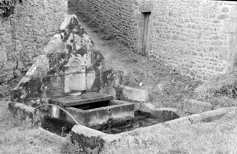Fontaine de dévotion : fontaine-mur avec niche, bassin entouré de deux clôtures basses avec sols recouverts respectivement de dalles de granite et de pavés. Lavoir : couvert, à charpente apparente ; fond du bassin en grandes dalles de granite.