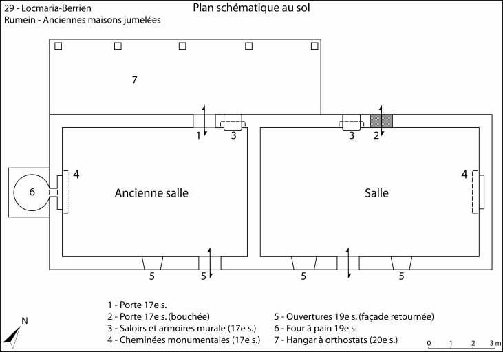 Mise en oeuvre mixte en moellon de granite et de grès, chaînages d'angle et encadrements des baies en pierre de taille de granite. Logis 1 : à deux pièces en rez-de-chaussée conservant une toiture en ardoise de montagne. Alignement : logis à deux pièces en partie remonté, en rez-de-chaussée. Ancien logis double : présence de deux portes en plein cintre et de deux saloirs. Façade principale retournée au sud-est au 19e siècle avec percement d'ouvertures. Logis sud-ouest probablement déclassé en dépendance avec ajout d'un four à pain sur le pignon.