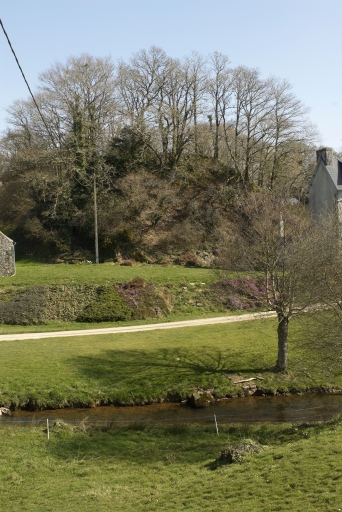 Vestiges de motte castrale du 11e ou 12e siècle à 300 mètres au sud-ouest du hameau du Helles, dite "Castel Helles" (le château de la vieille cour). Le monticule rocheux sur lequel ce tertre a été édifié a été exploité comme carrière de pierre dans les années 1940. La moitié du massif aurait été détruit à l'explosif. Dans la partie sud-ouest de la fortification, le fossé et la motte ont été altérés récemment lors de l'agrandissement de la maison d'habitation située dans la parcelle voisine. La motte contrôlait la voie de Scrignac à Bolazec. Le retranchement est communément appelé "Castel Montafilant" : il aurait appartenu à la famille de ce nom qui, au Moyen-Age, détenait le fief de Pestel entre Bolazec et la côte nord du Finistère. L. Le Guennec indique qu'il existait une cour de justice du Hellès-Montafilant au 17e siècle.