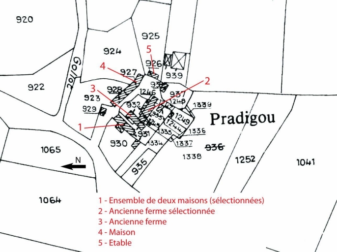 Le hameau de Pradigou est établi à proximité immédiate de la route de Scrignac à Bolazec. Sous l'Ancien Régime, il aurait abrité la maison du desservant, à l'époque où Bolazec était une trêve. Cette maison de notable du début du 17e siècle est toujours en place, sélectionnée pour étude. Ce noyau ancien a fédéré d'autres constructions : un second logis du 17e siècle à kuz gwele construit en face, remanié au 19e siècle, une grande ferme édifiée entre 1840 et 1876, des petites fermes reconstruites fin 19e siècle en alignement à l'emplacement de bâtiments plus anciens. Sur le cadastre de 1835, Pradigou ne compte que quatre bâtiments. Un ensemble de deux maisons et une ferme sont sélectionnés, deux logis sont repérés.