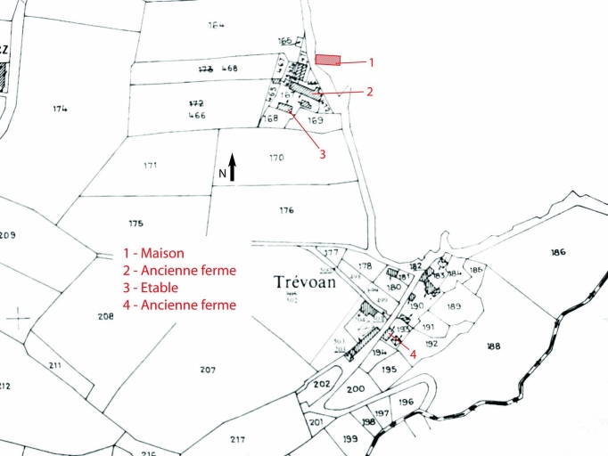 Le hameau de Trévoan compte une huitaine de maisons réparties en deux groupes, celui établi le plus au sud se trouvant à proximité immédiate de l'Aulne. Le logis du 17e siècle partiellement remonté à la fin du 19e siècle témoigne de l'implantation ancienne du hameau. Les autres habitations ne sont pas antérieures à la seconde moitié du 19e siècle. Les logis sont orientés sud et est. La comparaison avec le cadastre de 1835 et le cadastre actuel montre un parcellaire quasiment inchangé, malgré le prolongement du chemin de desserte du village jusqu'à la rivière et la reconstruction massive de l'habitat après 1835. Une maison et deux anciennes fermes ont été repérées.