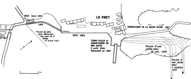 Face au développement des activités du port du Fret (trafic de passager, de marchandises et pêche à la coquille St Jacques), la construction d´un port est préconisée quelques années après la construction de la jetée qui arrive à saturation. Le quai est pratiquement achevé en juin 1862. Une cale située à l´ouest du quai est également édifiée en 1862, mais elle disparaît à l´occasion de la construction du terre-plein de la gare en 1922. Enfin, le quai est complété par une digue à l´ouest, qui délimite un chemin reliant le quai au sillon. Construite avec des pavés, elle s´est partiellement effondrée à hauteur de la gare ; des enrochements ont été déposés pour combler l´ouverture créée.