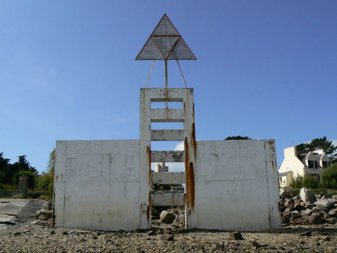 Les deux édifices fixes côtiers du sud-est de l´Île Longue, construits pour servir de repère à la navigation, étaient destinés à fonctionner ensemble. Ils sont de formes différentes, mais ils sont tout les deux surmontés d´un panneau triangulaire visible que le jour car dépourvu de dispositif lumineux. Faisant partie de la catégorie générale des amers, ces deux balises d´alignement sont implantées, l´une sur l´estran et l´autre en mer, à 500 m du rivage. La balise d´alignement implantée sur la grève se compose de deux murs en béton armé d´une longueur de 5 m, pour une hauteur de 4 m et une épaisseur de 0,50 m. Les deux murs sont reliés par une échelle, en béton également, de 6 m de hauteur (la forme de l´installation ne revêt pas un sens particulier pour la navigation), surmontée d´un triangle métallique reposant sur des pieds. Ce panneau de visibilité, de couleur blanche, est rehaussé d´un liseré rouge qui a perdu sa couleur. Cette première balise sert d´alignement avec le second ouvrage implanté en mer. Celui-ci se compose de deux cylindres en béton armé qui émergent d´une dizaine de mètres lors des basses mers. La tourelle ainsi constituée est, comme la précédente, surmontée d´un triangle métallique recouvert d´une peinture blanche.