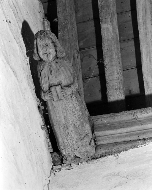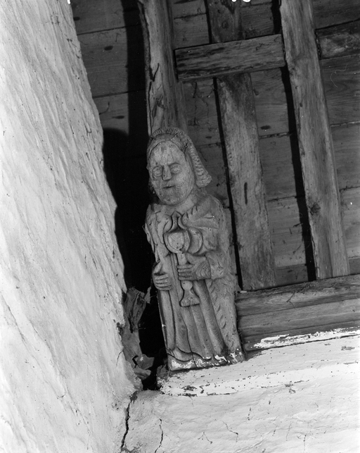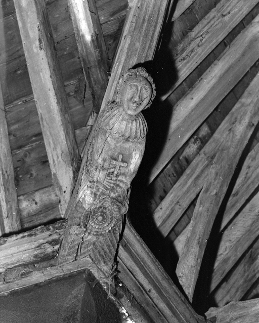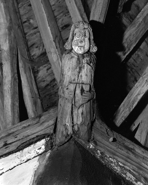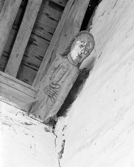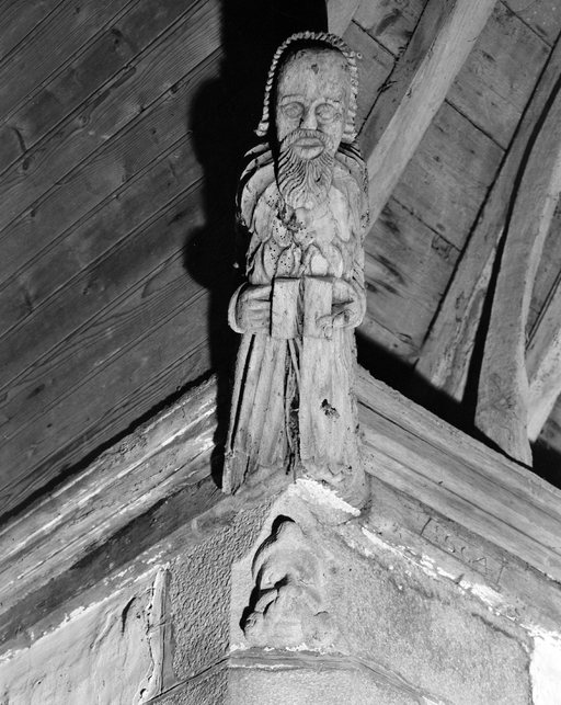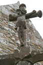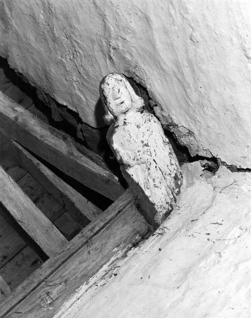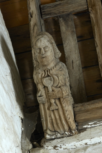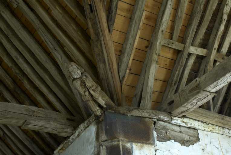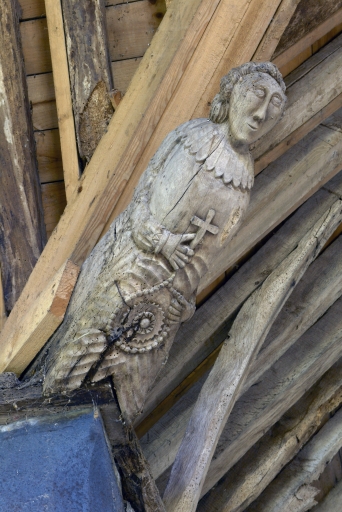 Anges présentant des phylactères (chevet). Têtes d'homme moustachus et casqués (angles choeur et bras du transept).