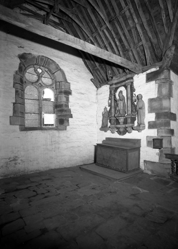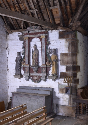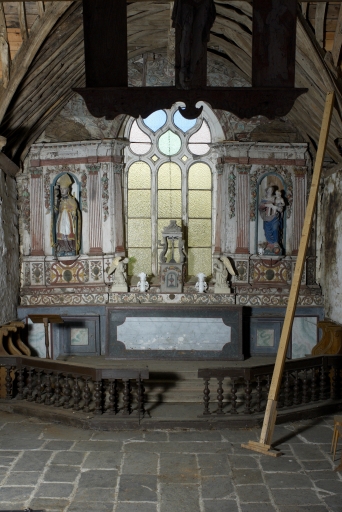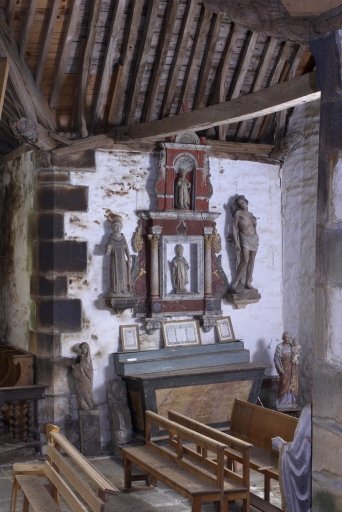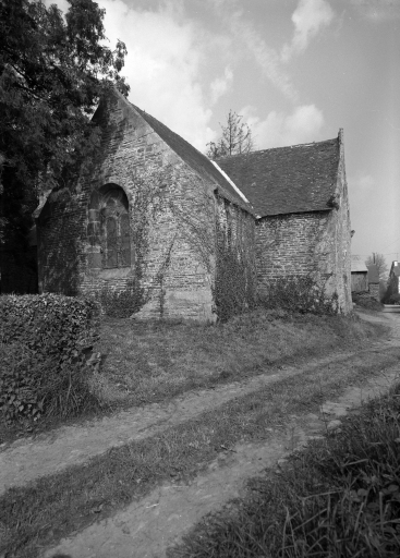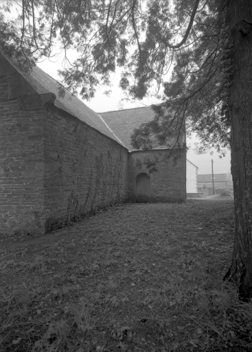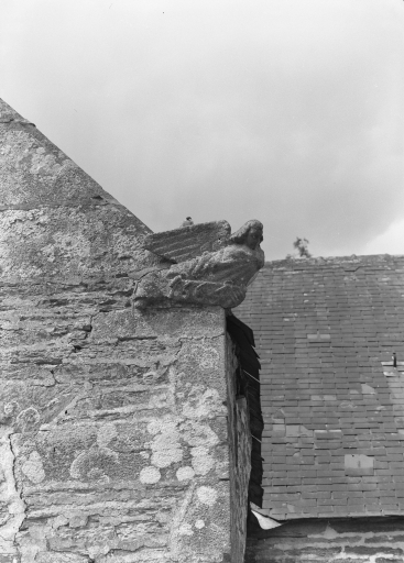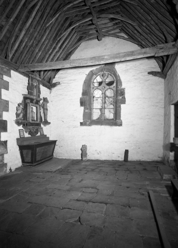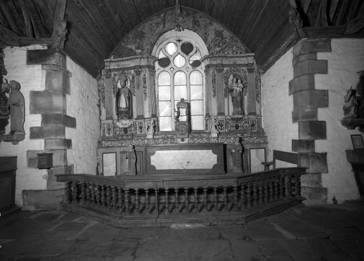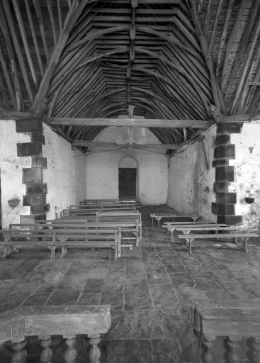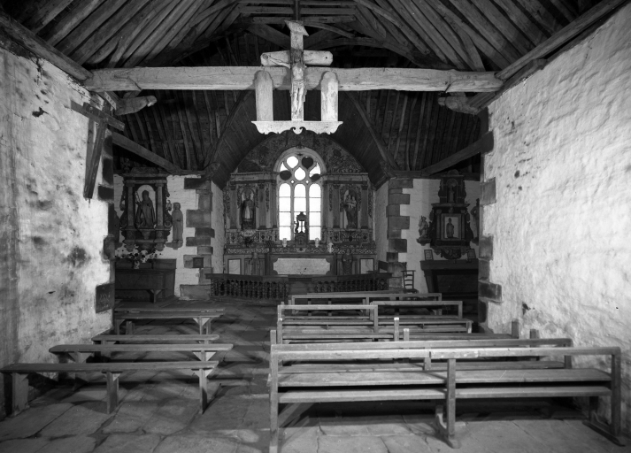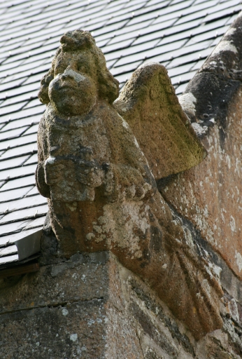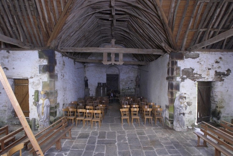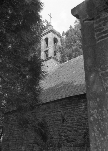 Edifice entouré d'un placître polygonal, avec calvaire au nord. Plan en croix latine à nef courte. Gros-oeuvre en moellon de schiste, encadrement des baies, chaînages d'angle, clocher et rampants des pignons découverts en pierrre de taille de microdiorite quartzique ou de kersantite. Sol couvert de grandes dalles de schiste. Charpente en chêne, lambris de couvrement disparu. Charpente de type à chevrons portant ferme, clés pendantes en forme de fleurons, entraits retroussés à engoûlants, douze blochets sculptés représentant les apôtres. Un des entraits de la nef porte les vestiges d'une poutre de gloire (statues latérales disparues).