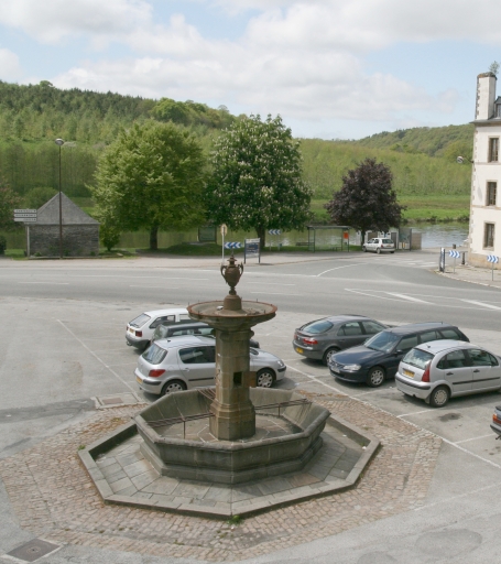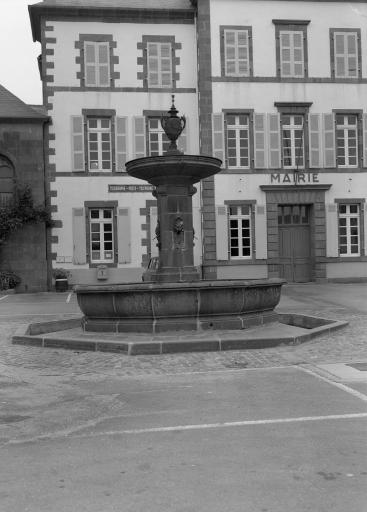 Fontaine isolée. Bassin hexagonal. Pilier carré percé de quatre masques crachant l'eau. Vasque circulaire surmonté d'un vase à usage de champignon d'eau. Oeuvre réalisée en granite provenant de Locronan et en kersantite. Masques et vase en fonte.