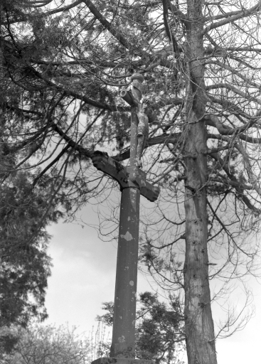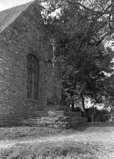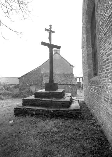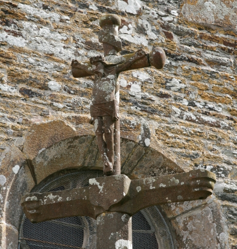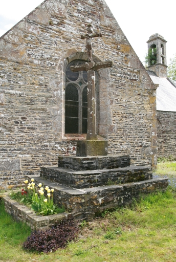 Ce calvaire attribué à l'atelier de Roland Doré porte la date de 1631 (socle). Les personnages latérales, sans doute la Vierge et saint Jean, mutilés, ont été entreposés à l'intérieur de la chapelle (têtes disparues) ; au moins une de ces statues provient du calvaire. Une tête, sans doute celle de saint Jean, a été malcontreusement placée sur la pierre d'assise nord du chevet de la chapelle, en remplacemnt d'une tête d'angelot disparue.