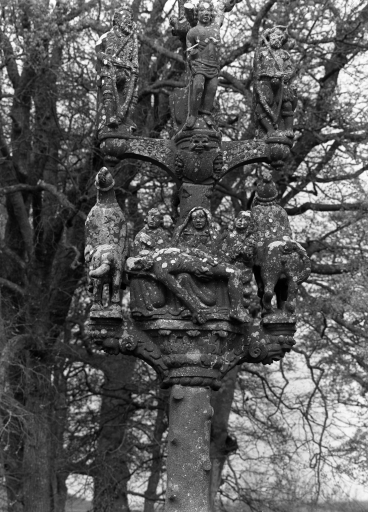 A l'ouest, sur le croisillon supérieur Christ en croix entre la Vierge et saint Jean. Sur la traverse inférieure, Christ souffrant accosté de soldats à cheval. Sur le noeud, amoiries des Kergoët et des Kerpaën tenues par des angelots. A l'est, sur le revers, saint Sébastien entre deux archers. Sur le noeud, armoiries des Kergoët encadrées de trois masques. Sur la traverse inférieure, groupe de la Vierge de Pitié. Au pied de la croix, groupe de la Résurrection. Au revers, sainte Marie-Madeleine et le donateur. Sur le socle, frise de seize masques. Sur les traverses, décor Renaissance de feuillage, de volutes et de macarrons.