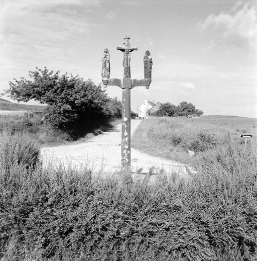 Calvaire crée dans la première moitié du 17e siècle par le sculpteur Roland Doré, de Landerneau, ou de son atelier, à la demande d'un prêtre dont les initiales H. T. sont sculptées sur le noeud. Sur le cadastre de 1848, il figure, isolé, au milieu du chemin, au carrefour menant au hameau de Moudennou.