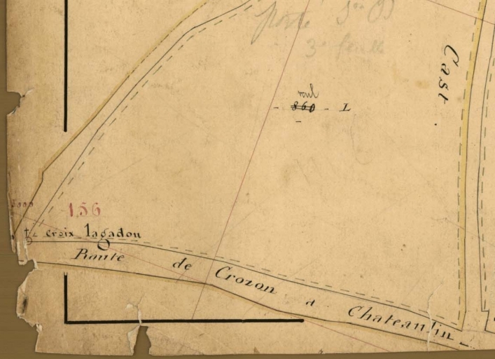 Cette croix de 1592 figure sur le cadastre de 1848 sous l'appellation "croix de Lagadou" en raison du nom du commanditaire gravée sur la partie inférieure du fût. Seuls le socle, la base et la partie inférieure du fût datent de cette époque. La partie supérieure et le Christ en croix, en kersantite, remontent à la fin du 19e ou au début du 20e siècles.