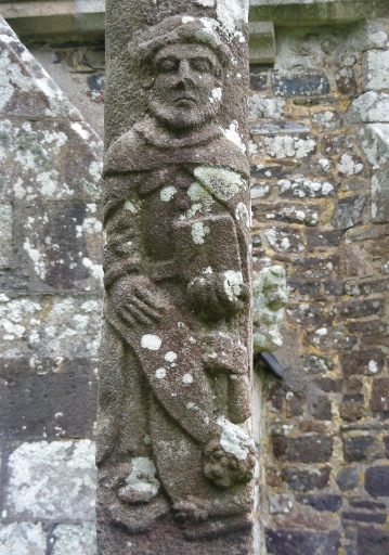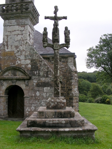 Fût en granite, croisillon en kersantite. Face ouest : saint Marc (partie inférieure du fût). Christ en croix, Vierge, saint non identifié (saint Yves ?), anges recueillant le sang du Christ dans un calice, sainte Face (sur le noeud). Face est : saint Jean, évêque (saint Exupère ?), saint François d´Assise, blason sur le noeud. Statues géminées (sculptées dans un seul bloc) : Vierge et saint François d´Assise, saint non identifié (saint Yves ?) et saint Jean.