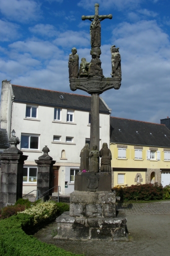 Réalisation en kersantite, à l'exception du soubassement, en granite. Table d'offrande adossée à la face ouest du soubassement. Socle, face ouest : sainte Marie-Madeleine, saint Jean, moine (saint François d'Assise ?). Elévation ouest : Vierge, évêque, Marie-Madeleine, saint Jean, Christ en croix, anges recuillant le sang du Christ dans un calice. Socle, face est : sainte Face. Elévation est : saint Pierre, saint Sébastien, groupe de la Vierge de Pitié, Christ souffrant.