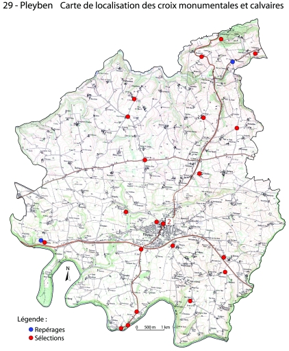 Parmi les 24 oeuvres sélectionnées, 19 sont des croix, cinq des calvaires. Ils sont répartis de manière à peu près uniforme sur l'ensemble du territoire communal, à l'exception du quart nord-ouest et de la frange centrale est qui en sont dépourvus.