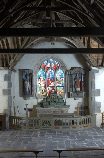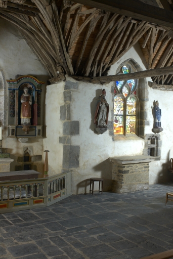 Édifice de plan en croix latine, avec bras de transept très allongés et chevet peu saillant. Chevet et bras nord étayés par d´imposants contreforts. Nef éclairée au nord par une seule ouverture en arc brisé. Bras de transept accessibles par des portes (en arc brisé au sud, plein cintre mouluré au nord) et éclairés par des fenêtres (deux au sud, une au nord) en arc brisé à réseau flamboyant. Maîtresse-vitre en arc brisé à réseau flamboyant. Porte de la sacristie dans-oeuvre en arc brisé. Sol couvert de dalles de schiste. Sablières sculptées (sauf dans la nef). Charpente à arbalétriers courbes et entraits retroussés à engoulants, clés pendantes sculptées (fleurons, têtes d´angelots). Blochets figurant des anges portant les instruments de la Passion à la croisée du transept. Fontaine couverte d´une voûte en plein cintre abritant une statue moderne.