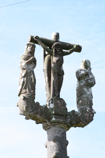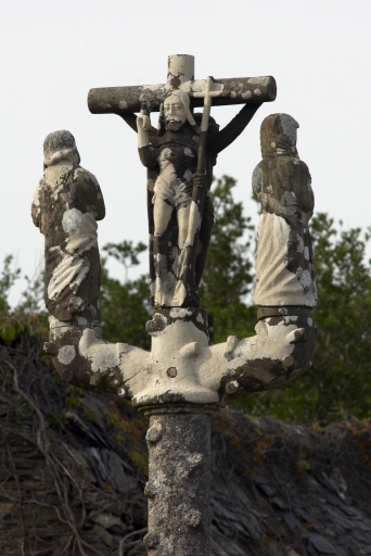 Emmarchement en moellon de schiste à trois degrès ; base carrée à pans, fût à écots en granite ; traverse frappée d'armoiries buchées portant un groupe de la crucifixion (saint Jean, Vierge et Christ en croix) face nord, Christ ressuscité (face sud) en kersantite.