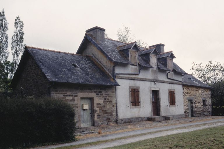 Logis : plan de type ternaire en rez-de-chaussée ; comble à trois lucarnes ; murs : moellons enduits ; perron, bandeau horizontal au niveau du comble et encadrements des baies : pierre de taille de granite ; soubassement : moyen appareil de schiste ; deux souches de cheminée. Deux dépendances de part et d'autre du logis (ajouts anciens) ; à gauche : moyen appareil de schiste, linteaux de bois ; toit à longs pans ; à droite, murs : moellons de schiste, encadrement des baies : pierre de taille de granite. État actuel : enduit ciment sur le logis, souches de cheminée cimentées.