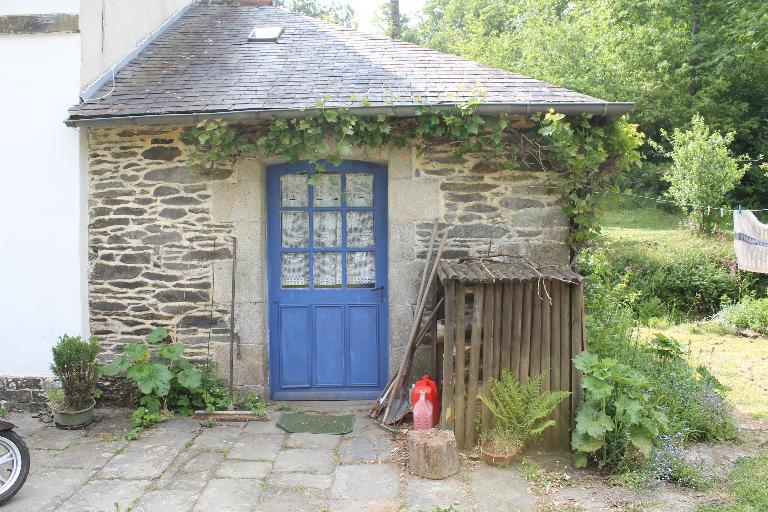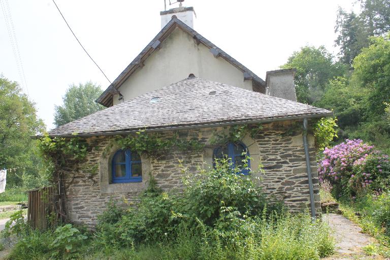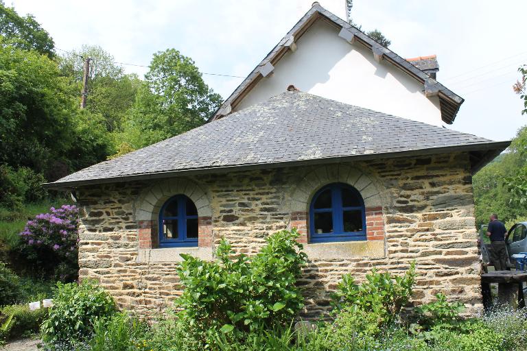 Deux dépendances de part et d'autre du logis (ajouts anciens) : toit à longs pans & croupe ; murs : moellons de schiste ; deux portes en arc surbaissé et encadrements harpés ; à gauche : deux fenêtres en demi-cercle dans le mur de croupe.