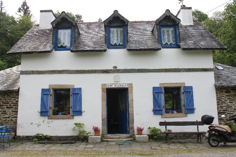 Maison éclusière construite en schiste. La maison comprend un étage avec deux chambres et une pièce centrale où deux cheminées se font face. Une étable et une écurie sont construites de part et d'autre de la maison. Elles sont restaurées et réaménagées en pièce d'habitation, une cuisine en contrebas pour l'une et une pièce pour l'autre. Ces deux bâtiments attenants disposent d'une porte d'entrée sur la façade et de deux fenêtres sur le pignon. Une ligne de pierres d'ardoise en saillie traverse la façade au tiers supérieur de la maison principale. Trois fenêtres en chien assis sont situés à l'étage en façade. Le perron est en granit et le dallage devant la maison en ardoise. Une inscription orne le fronton de la porte d'entrée reprenant le nom du lieu en breton "Koz Kastell". Des "douves" sont construites autour de la maison permettant à l'eau du canal de s'écouler autour de la maison l'empêchant ainsi d'être inondée lors des crues. Le système des douves se remplit d'eau par le canal à l'est de la maison puis passe à l'arrière et la tranchée se prolonge 20 mètres plus loin et se jette dans le canal près du pont. Trois ouvertures en granit avec pierres en granit arrondies permettent à l'eau d'entrer. Un système d'ouverture en bois, endommagé, est toujours en place.
