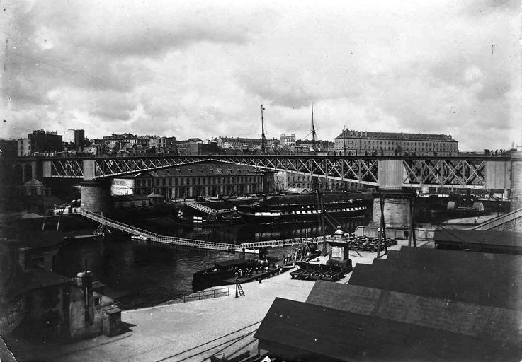Projet de pont mobile par Tritschler présenté au Conseil Municipal le 8 décembre 1843. Projet de pont mobile tournant par les ingénieurs Cadiat et Oudry en 1852. Le pont est mis en place en 1861 pour l'administration des Ponts et Chaussées. Le Pont National détruit lors de la bataille de Brest en septembre 1944. L'inauguration du nouveau pont mobile levant baptisé "pont de Recouvrance" a lieu en 1954. Les piles du pont tournant subsistent à l'état de vestiges.