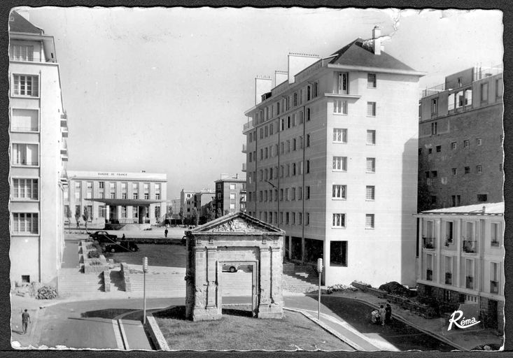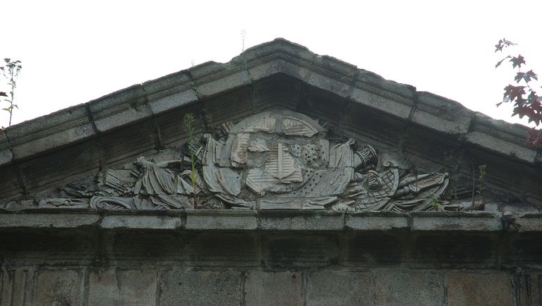 Square Commandant l´Herminier : porte monumentale de l´ancien séminaire des Jésuites conservée et remontée à l´emplacement de l´ancienne préfecture maritime. Trophée avec armes, drapeaux et ancre de marine sur le fronton.