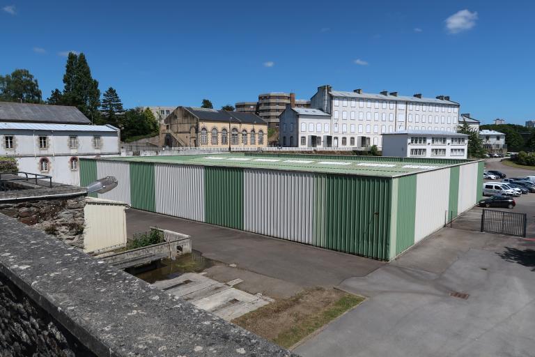 Grand bâtiment à usage de caserne, orienté vers le sud-ouest. Le corps de bâtiment principal à dix-huit travées est flanqué de deux pavillons à quatre travées. La travée centrale, reconnaissable à ses fenêtres doubles, abrite l’escalier. Le bâtiment est doté de trois étages ; les deux pavillons, d’un étage. Pignons éclairés de fenêtre (certaines fenêtres transformées en porte). L’entrée axiale sud-ouest du corps de bâtiment principal est surmontée d’une plaque indiquant "PAVILLON GIFFARD / 1894-1895". Maçonnerie enduite ; entourages des ouvertures (fenêtres et portes à linteau en arc surbaissé avec clé), pilastres de la travée centrale double et chaînage d’angle en pierre de taille de granite. Couverture en zinc ; dix souches de cheminée.