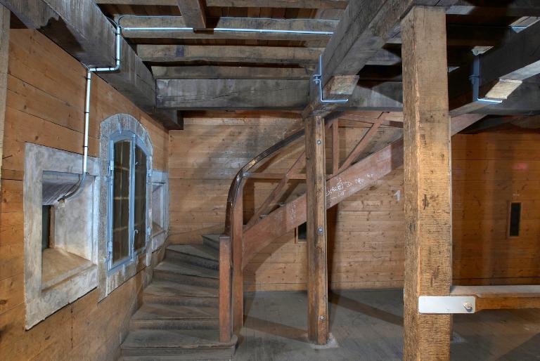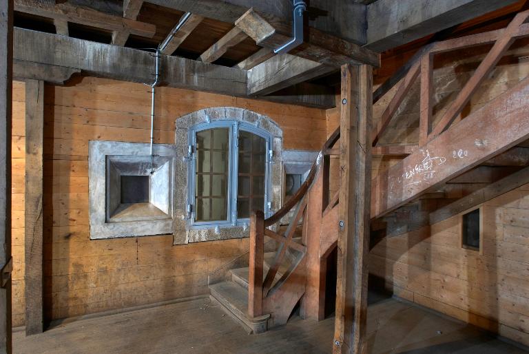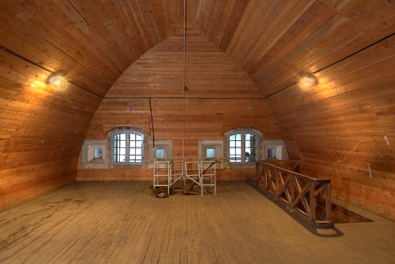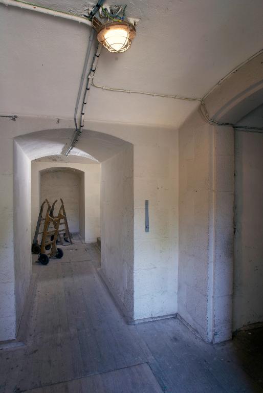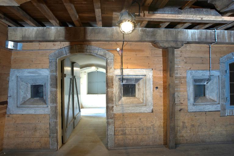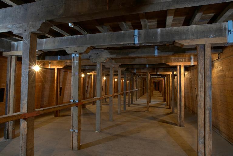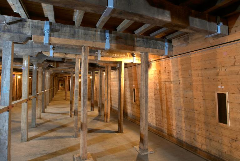 Innovation architectonique, ces magasins sont dotés d´un sas d´entrée à chaque extrémité, de gaines de ventilation en sous-sol et de créneaux à lampe permettant de donner artificiellement de la lumière aux soutes via une chambre d´éclairage. Le plus petit magasin de la rive ouest, en mauvais état, a été récemment détruit [nous sommes en 2011] mais au moins deux des grands magasins voûtés ont gardé leurs dispositions d´origine : planchers et escaliers en chêne, lambris en châtaignier. Ils disposent toujours de huit créneaux de lampe et de trois fenêtres dotées des huisseries originelles, desservis par une chambre d´éclairage à chaque pignon. Leur couverture en tuile à deux pans et croupes sur charpente semble d´origine. La surface totale additionnée du rez-de-chaussée et de l´étage de chaque grande poudrière avoisine 800 m². Selon l´Index de la fortification française, 1874-1914, chaque magasin a une capacité de 160 t de poudre.