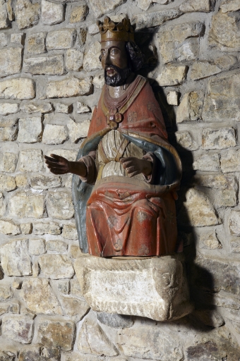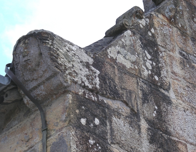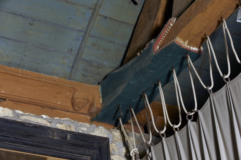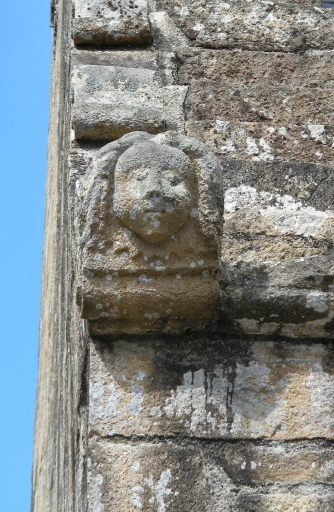 Pignon ouest, angle nord : sirène. Pignon ouest, angle sud : tête humaine. Arêtes de la flèche : têtes humaines.