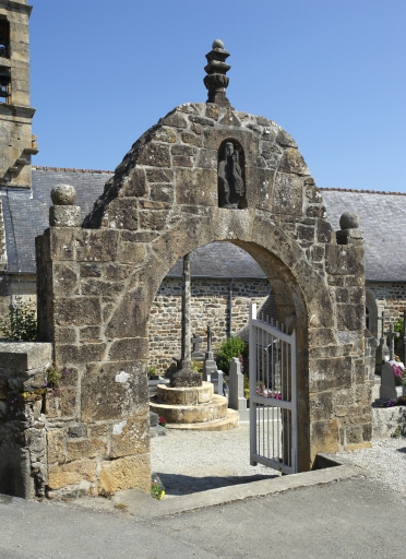 Fondations de l´édifice en dessous du niveau du cimetière. Présence de plusieurs contreforts (est, nord) à cause de la déclivité du terrain qui surplombe la grève de la rivière de l´Aulne. Plan rectangulaire sans transept. Choeur à chevet plat séparé par deux arcades d´un bas-côté nord. Arc diaphragme séparant la nef et le choeur. Gros oeuvre en moellon de grès, de schiste et de granite, à l´exception de l´élévation ouest, de la sacristie et du portail, en microdiorite quartzique, et du porche, en kersantite. Tour carrée abritant la chambre des cloches surmontée d´une flèche polygonale peu ajourée et aux arêtes figurant des têtes humaines. Sacristie hors oeuvre de plan polygonal. Portail monumental percé d´une porte en plein cintre surmontée d´un massif maçonné avec niches.