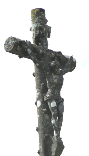 Emmarchement circulaire en microdiorite. Base carrée, fût circulaire à chapiteau et Christ en croix en kersantite.