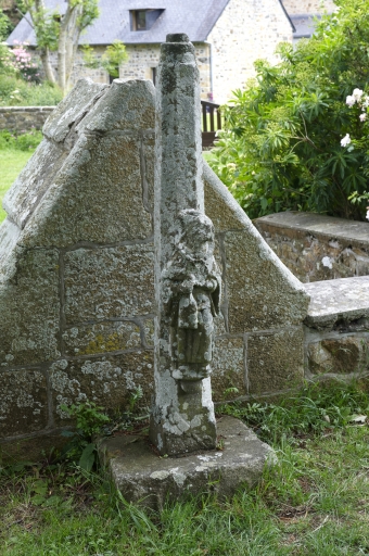 Croix déposée près du pignon de la fontaine de dévotion. Socle sans rapport avec la croix. Fût raccourci. Statue sculptée dans le même bloc que le fût.