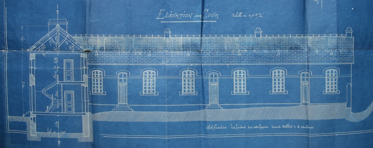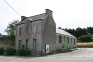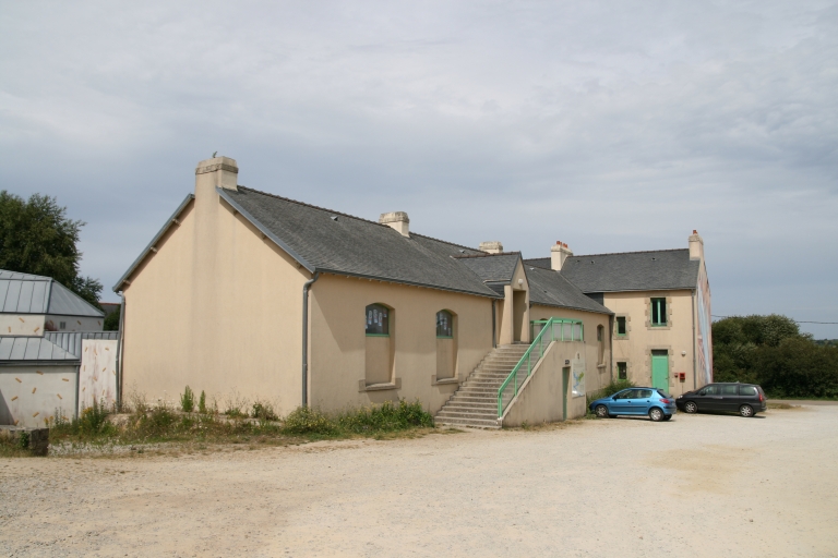 Gros-oeuvre en moellon de pierre couvert d´un enduit, encadrements des baies en pierre de taille de granite. L´ensemble est constitué d´un bâtiment à un étage et une façade ordonnancée à six travées qui abritait les logements du directeur de l´école et de son adjoint séparés par un mur de refend et d´une aile en retour d´équerre destinée à trois classes d´enseignement primaire. La cour, au sud-ouest de l´école, est délimitée par des murs dont un, au sud-ouest, sur lequel s´adosse le préau (en partie détruit) et un second, au sud-est, sur lequel s´appuyaient les commodités (détruites).