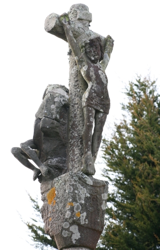 Emmarchement en schiste et microdiorite quartzique, base carrée, fût circulaire, noeud et Christ en croix en granite, groupe de la Vierge de Pitié en kersantite laissé, sur le revers, sous le coup de l'outil ; ce groupe, rapporté, n'occupe pas son emplacement d'origine.