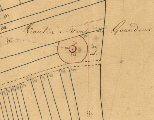 Le chiffre des moulins repérés correspond à celui donné par les travaux historiques. Le chiffre des moulins étudiés correspond aux huit moulins à vent encore en élévation, sélectionnés sur les 12 restants, ainsi qu´aux vestiges du moulin à marée du Fret. Ce patrimoine artisanal jadis très important pour l´économie locale a fait l´objet de plusieurs études très approfondies auxquelles il convient de se référer et qui permettent de comprendre son histoire et son évolution (voir bibliographie). Dès l´époque médiévale, les moulins à vent, très nombreux, occupent le plateau de la presqu´île en profitant des forces éoliennes du littoral proche. Les documents cartographiques anciens (Atlas maritime des côtes de France, 1764, carte de Cassini, vers 1770) ne semblent pas mentionner la totalité des moulins existants. Ce sont les archives seigneuriales et les premiers plans cadastraux (1830-1831) qui fournissent les éléments les plus pertinents. Sous l´Ancien Régime, la plupart des moulins, à eau ou à vent, relèvent de la propriété noble que se partagent les seigneurs de Crozon et de Poulmic ainsi que les abbés de Landévennec. Plusieurs moulins dépendaient directement de manoirs (Keramprovost, Kerivoaler, Lescoat, La Palue, Quélern, Gouandour, Treyer, Trébéron). La production de la farine (blé, seigle) était prédominante, destinée pour partie à être expédiée vers Brest pour les besoins de la ville et de la Marine. Des travaux de reconstruction et de renouveau technique - en témoignent avec abondance les documents d´archives - ont lieu tout au long du 19e siècle. La plupart des moulins encore en élévation semblent avoir été reconstruits dans la première moitié du 19e siècle, à l'exception peut-être du moulin de Goulien. Le cadastre ancien fait état de 109 moulins sur toute la presqu´île dont 60 sur le seul territoire de Crozon qui comptent alors 43 moulins à vent, 17 moulins à eau dont un moulin à marée. Dix-neuf moulins, toutes énergies confondues, sont en service en 1918 et servent, à l´occasion, d´amers à la navigation maritime. Les derniers moulins ont arrêté leurs activités après la Seconde Guerre mondiale, comme, par exemple, le moulin à eau de Pont-Men (1956) ou le moulin à vent de Treyout. Quelques vestiges du mécanisme sont conservés à Ménesguen.