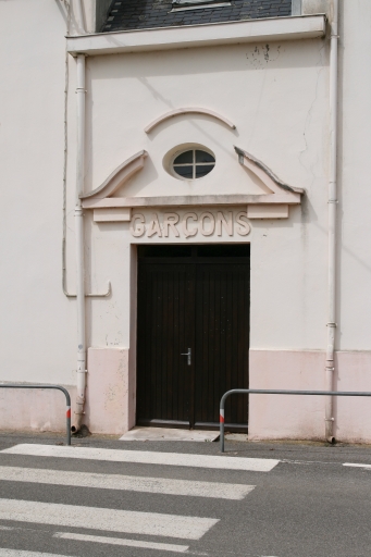 Gros-oeuvre en moellon de pierre couvert d´un enduit, encadrement des baies des bâtiments du 19e siècle en pierres de taille de kersantite. L´ensemble initial est constitué d´un corps de bâtiment à étage et élévation ordonnancée à quatre travées (ancien logement des instituteurs comprenant le rez-de-chaussée et l´étage) et d´un corps de bâtiment en retour d´équerre avec préaux, séparés, pour filles et garçons au premier niveau et classes au second niveau. Les deux corps de bâtiments latéraux ajoutés en 1938 abritent chacun, au rez-de-chaussée, une classe et un vestibule d´accès (séparation filles et garçons) ainsi qu´un logement de quatre pièces à l´étage. Emploi du ciment moulé pour le couronnement des portes d'accès de 1938.