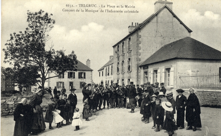 Au centre du territoire communal, un peu à l'écart de la route départementale Châteaulin-Crozon, le bourg de Telgruc-sur-Mer n'est encore qu'un minuscule chef-lieu sur le cadastre de 1831. Cependant, la structure de l'agglomération est déjà en place à cette époque avec son réseau convergeant de chemins vicinaux. Une dizaine de bâtiments est figurée au nord du noyau ancien formé par l'église paroissiale, le cimetière et le presbytère. En 1843, Bachelot de La Pilaye dénombre sept ménages au bourg dont le notaire, le bureau de tabac, la cure, deux auberges, un forgeron, un cultivateur, un cordonnier-sabotier. C'est à partir du milieu du 19e siècle que le bourg s'agrandit de manière significative avec le déplacement du cimetière à l'est de l'agglomération (1863) et la construction d'écoles. Une première école de garçons est édifiée en 1845 à l'emplacement de la mairie et de la poste actuelles. Elle est agrandie en 1878 pour ouvrir une classe de filles. En 1901, une nouvelle école de garçons est inaugurée à l'emplacement de l'école primaire actuelle. En 1944, les bombardements concentrés autour de l'église paroissiale et des rues adjacentes causent des dommages considérables. Aucun bâtiment communal ne subsiste (mairie, poste, église, presbytère, écoles), soixante dix-neuf bâtiments sont détruits ou très endommagés dans le périmètre du plan d´urbanisme. En effet, dès 1946, la commune est dotée d'un plan et d'un programme de reconstruction suivi d'un projet d'aménagement confié à l'architecte Georges Yvinec de Quimper. Ils offrent la possibilité de repenser les problèmes relatifs à la circulation, à l'habitation et à l'esthétique selon les aspirations d'après guerre : une place est ordonnée autour de l'église, jusqu'alors enserrée par des maisons ; le tracé des voies existentes est élargi, en particulier la départementale dans la traversée du bourg. Un groupe mairie-poste est construit sur le terrain communal de l´ancienne école des filles tandis qu´un groupe scolaire mixte est édifié en 1956, en remplacement de l'ancienne école de garçons, dont il ne subsiste que l'aile de classes. Le presbytère est reconstruit et l'église agrandie sur les plans de l'architecte Jacques Lachaud, approuvés en 1947. La même année, l´entreprise de maçonnerie Gouritin s´installe au lieu-dit Ménez-Luz, en bordure de la route menant aux carrières de moellons. La reconstruction s'échelonnant sur une dizaine d'années, l'usage de baraques en bois s'avère indispensable, notamment pour l'école et l'église. En remerciement de l'aide financière apportée par la ville marocaine de Sidi Aya du Gharb en 1945, une stèle est érigée contre le mur du cimetière représentant l'église de Telgruc et la mosquée de Sidi Aya.
