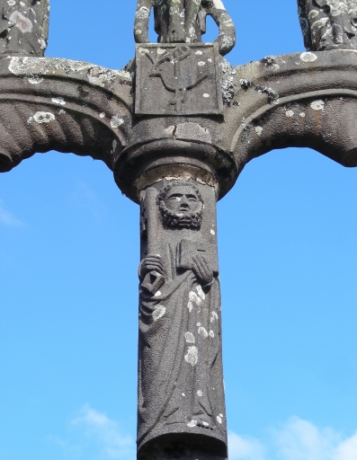 Base avec table d'offrande à l'ouest. Socle de 1593 remployée lors de la restauration de 1891. Fût monolithe en kersantite avec haut-relief figurant saint Pierre sur la face ouest. Statues géminées de la Vierge et de saint Jean (ouest), d'un apôtre ou saint Thomas (?) et d'une sainte femme (est). Dais gothique coiffant les statues géminées du Christ en croix (ouest) et du Christ ressuscité (est).