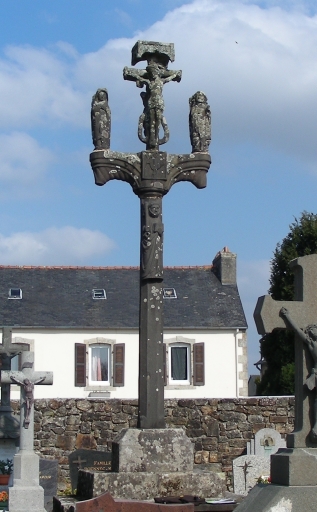 Œuvre hétérogène datant de plusieurs époques. Groupe de crucifixion, dais et phylactère avec inscription en lettres gothiques probablement début 16e siècle. Traverse datée 1617 portant les armoiries de Jean Brient, abbé de Landévennec (ouest) et le nom des fabriciens, peut-être Ian Guen et Marc Gall (est). Socle daté 1593 et 1891 (restauration). Fût (face ouest avec haut-relief figurant saint Pierre) probablement fin 19e siècle.