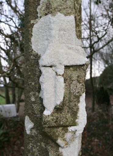 Emmarchement, socle et fût en granite. Fût portant une marque professionnelle (marteau, équerre) sans doute celle du commanditaire, un tailleur de pierre ou un maçon.