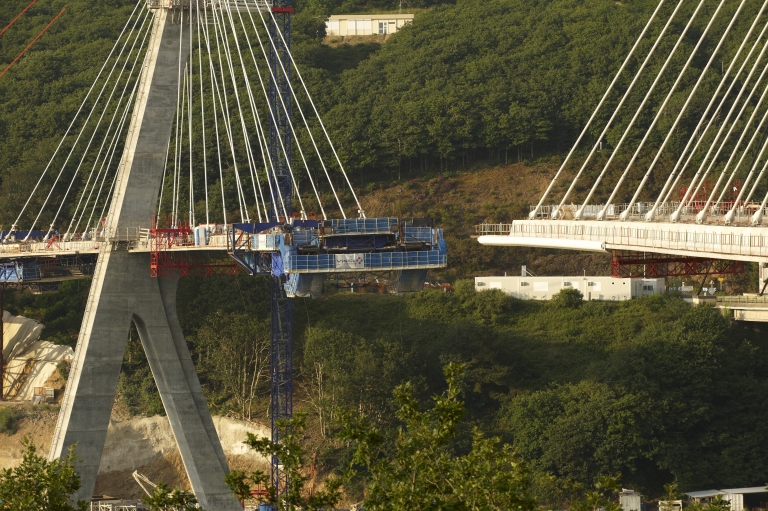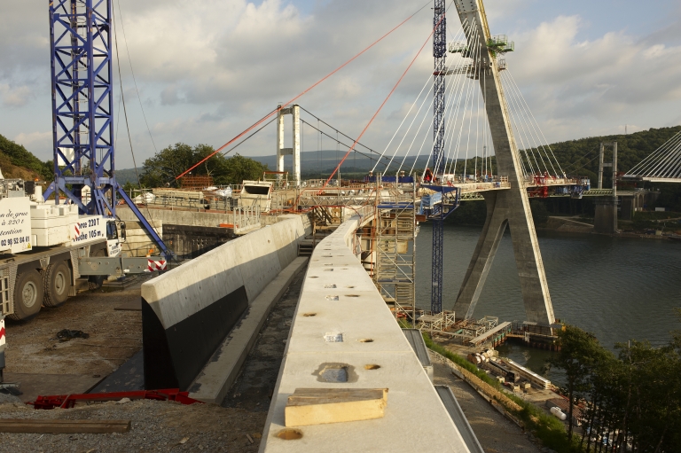 Passage par bac au moins depuis le 18e siècle assurant la liaison entre le Faou et la presqu' île de Crozon. Cales restaurées en 1836 et 1857. Début des travaux de maçonnerie en 1913, interrompus entre 1914 et 1920 et achevés en 1923, d'après les plans de Pigeaud, ingénieur des Ponts et Chaussées et agent voyer du département du Finistère ; travaux réalisés par l'entreprise de maçonnerie Autajon et les établissements Five-Lille pour la superstructure mise en place en 1925. Destruction en 1944 et reconstruction du pont actuellement en service entre 1945 et 1951. Le nouvel ouvrage, premier pont courbe à haubans en France et dont la jonction du tablier terrestre et du tablier suspendu a été achevée en juin 2010, est en cours de réalisation (conseil Général, maître d´œuvre, Charles Lavigne, architecte, Michel Virlogeux, ingénieur en chef des Ponts et Chaussées, Vinci Construction France, réalisation). La mise en service est prévue pour le premier trimestre 2011 (515 mètres de tabliers soutenus par 144 haubans).
