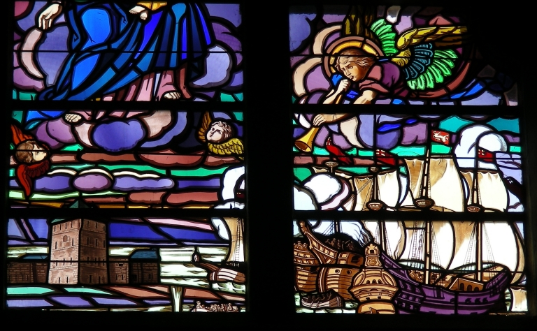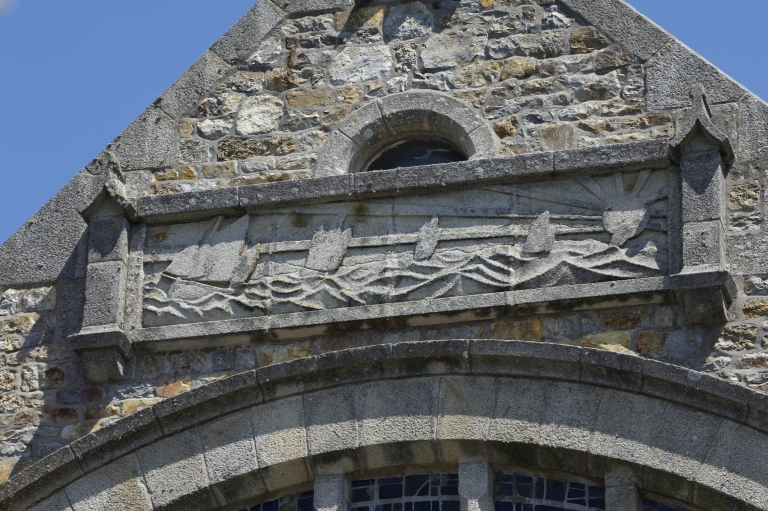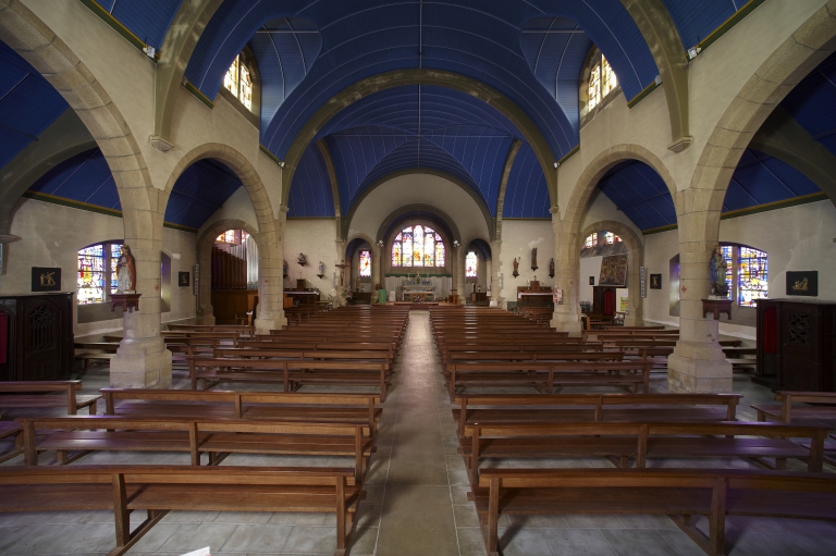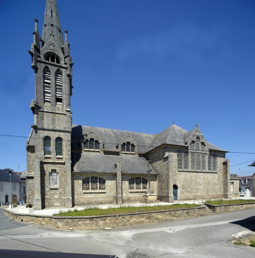 Édifice de plan allongé. La nef, très large est à trois travées flanquée de bas-côtés étroits et éclairée par des baies hautes triplées. Faux transept. Le chœur est à deux travées et bas-côtés. Le chevet est plat. L'ensemble est couvert de lambris et la charpente est en béton armé apparente. A l'ouest, l'avant nef est occupée par une tribune. Au sud, le clocher-tour latéral est hors-oeuvre. Le gros œuvre est en moellon de grès et de schiste, à l'exception des soubassements, des encadrements des baies, des pierres d'angle, de la tour et de la flèche, en granite provenant de Locronan. Des bas-reliefs figurant des bateaux ou des ancres marines coiffent le pignon ouest et les frontons des baies sud. Une hermine coiffée d´une croix celtique surmonte le pignons sud, des hermines figurent sur les quatre gâbles de la flèche. La chambre des cloches de la tour carrée est ajourée à abats-son en bois, tandis que la flèche polygonales est presque aveugle, cantonnée de gâbles et de pinacles. Les vitraux ont été réalisé par Labouret et J.J.K. Ray.