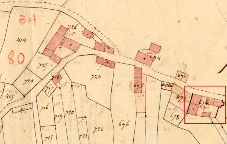 Édifice construit dans la 2e moitié du 18e siècle. Le cadastre de 1831 indique la présence d'un corps de logis et de quatre dépendances dont un fournil. Dans la 2e moitié du 19e siècle, une grange est flanquée au logis et une dépendance est érigée à l'emplacement de l'ancienne entrée, fermant ainsi la cour au nord.