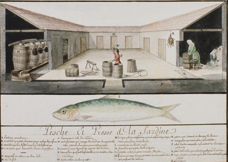 " Dans les endroits où l'on pêche beaucoup de sardines, il y a des marchands saleurs qui achètent et préparent les poissons que leur apportent les pêcheurs, et en outre les propriétaire de chaloupes préparent les sardines que leur livrent leurs pêcheurs. Les uns et les autres établissent au bord de la mer des corps de logis quelques fois assez grands : souvent ce ne sont que de petits magasins au rez-de-chaussée, qu'ils nomment presses à sardines, dans lesquels ils reçoivent les poissons que leur apportent les pêcheurs, et où ils ont ce qui leur est nécessaire pour les préparer ; savoir, des pelles servant à répandre le sel (...), pour transporter les sardines ; des baguettes ou ainettes, pour les enfiler par la tête ; de faux fonds ; une bonne provision de sel ; des barils, des presses. Il y a dans ces presses sept à huit femmes et des hommes (...). Ordinairement on fait avec ces ouvriers et ouvrières des conventions pour la durée de la pêche, et on les paie lorsqu'elle est faite.