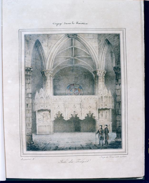 Chef-d’œuvre du gothique flamboyant, entièrement réalisé en kersantite*, le jubé du Folgoët est une pièce majeure, seule de ce genre en Bretagne. À juste titre présenté en 1852 par le marquis de Coëtlogon comme l’un des plus beaux de France, il est très proche et contemporain de celui de la basilique Notre-Dame-de-l’Épine en Champagne, important sanctuaire de pèlerinage qui bénéficie entre le XIIIe et le XVe siècle de la faveur des rois de France. Le jubé de la cathédrale d’Exeter, édifié en marbre de Purbeck entre 1318 et 1325, dans le plus pur Decorated Style, lui a probablement servi de modèle. Le même parti de trois travées voûtées retombant sur des piles fasciculées, le même décor de lambrequins ajourés qui souligne les arcs, et jusqu’au motif en résille à base de quadrilobes du garde-corps du Folgoët, identique à celui des coursières employé partout dans la cathédrale anglaise, établissent la filiation stylistique. Au revers, sur l’arc central, un écu chargé de trois fasces, qui passe pour être celui de Guillaume Le Ferron, situe la construction de ce jubé vers le milieu du XVe, voire dans le troisième quart de ce siècle. À la fin du XVe ou au début du XVIe siècle, le jubé fut complété par une clôture de chœur destinée à enfermer les stalles des chanoines. Celle-ci présente sur ses faces extérieures trois arcades aveugles surbaissées qui correspondaient aux enfeus de différentes familles nobles. La qualité exceptionnelle de la sculpture du jubé fit l’admiration des archéologues dès les années 1830, mais faillit pâtir en 1840 d’un projet de restauration visant à restituer les arcs-boutants qui renforçaient ses angles vers la nef, prévoyant en fait un démontage complet qui aurait entraîné une réfection plus ou moins fidèle. Cette entreprise hasardeuse ne connut par chance qu’un commencement d’exécution, sur la balustrade du côté du chœur. Encore, le résultat obtenu jugé décevant, on contraignit les sculpteurs à replacer les éléments anciens qu’ils avaient déposés. En fait, grâce à la vigilance de Miorcec de Kerdanet et du marquis de Coëtlogon, l’ensemble du jubé a échappé au démontage prévu et la quasi totalité de sa sculpture a pu préserver son authenticité.