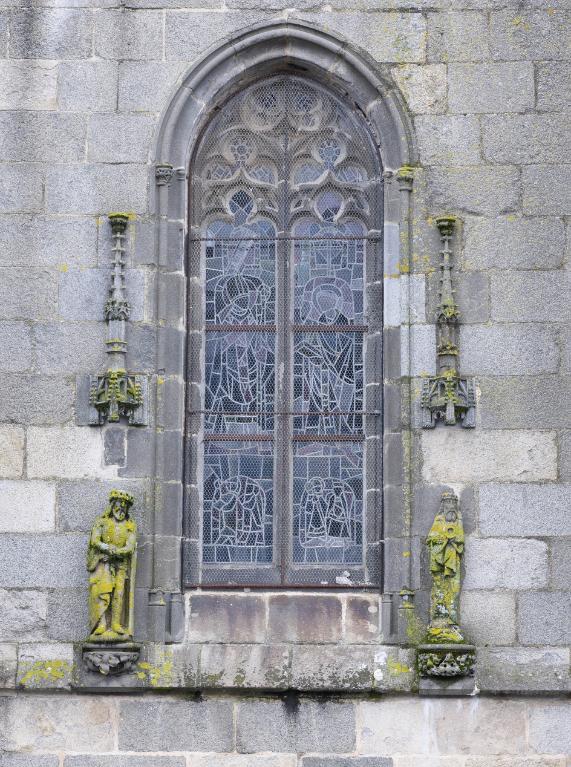 La qualité et la richesse de traitement du front sud de la collégiale sont tout aussi remarquables. Les contreforts à arête médiane sont ornés sur leurs pans coupés de niches à dais destinées à recevoir un programme statuaire ; de part et d’autre des fenêtres, des socles à feuillages refouillés surmontés de dais, également conçus pour une série de statuettes de dimensions réduites, complètent ce décor dont le parti d’élévation, aussi raffiné que luxueux, est unique en Bretagne. En haut du mur, des carreaux de kersantite* unis, modernes, remplacent depuis le XIXe siècle les anciens écus armoriés, auxquels devaient répondre, à l’intérieur, dans les vitraux des baies du collatéral, les écussons marquant les fondations des familles nobles. Au milieu de cette riche élévation, le porche sud de la nef a conservé sur son trumeau la statue d’Alain de La Rue, évêque de Saint-Pol entre 1411 et 1420, dont les armoiries sculptées sur le socle indiquent qu’il devait lui aussi correspondre à cette première phase du chantier. Sa remarquable mise en œuvre et sa sculpture délicate offrent un exemple très convaincant de l’adoption précoce par les grands chantiers bretons des formes du flamboyant. Le principe de l’arc bordé d’un lambrequin à suite d’arcs trilobés aux écoinçons évidés est peut-être ici un des premiers exemples du genre en Bretagne.Le porche aux apôtres, la sacristie qui lui fait suite et la pièce qui la surmonte, couramment appelée “ chambre du trésor ”, forment un ensemble avec la grande chapelle. À l’ouest, sur les deux pignons accolés de cette partie de la collégiale, la plus richement ornée, onze niches, pour la plupart surmontées d’arcs en accolade destinées à abriter les armoiries du duc et de ses principaux vassaux, témoignent du rôle majeur que remplit alors le chantier du Folgoët dans la stratégie des Montfort. Même si ce fastueux programme héraldique a pâti des destructions révolutionnaires, la qualité du décor sculpté qui devait le mettre en valeur est particulièrement sensible. Le couronnement à suite de quadrilobes qui épouse ici les gâbles des pignons, transposition hardie d’un motif habituellement réservé aux garde-corps horizontaux, est une restitution fidèle à partir des vestiges encore en place au XIXe siècle. À la rencontre des deux pignons, une statue de Jean V, en armure, couronné, tenant le sceptre dans sa main droite et dans sa main gauche le livre, emblème réservé aux fondateurs, vient conforter l’attribution à ce prince (1389-1442) de la paternité de toute cette partie de l’édifice. À l’intérieur du porche, les deux clés de voûtes aux armes d’alliance Bretagne-Navarre et Bretagne-France font respectivement allusion au père du duc, Jean IV, à son épouse, Jeanne de Navarre, à Jean V lui-même et à Jeanne de France. L’importance de l’emploi de la kersantite* y est liée à la richesse ornementale recherchée et, à cette fin, l’intérieur du porche est entièrement réalisé dans ce matériau, qui a permis la réalisation d’une sculpture de haut niveau, presque sans égale en Bretagne. Sur les voussures de l’arc d’entrée, des guirlandes de feuilles refouillées, bien qu’altérées par les dégradations humaines et les intempéries, laissent encore apprécier cette qualité exceptionnelle. La même recherche de virtuosité se retrouve à l’intérieur, dans les dais ajourés qui surmontent les statues des apôtres ainsi que dans la voussure qui encadre les deux portes d’accès à la chapelle sud. Au-dessus du trumeau qui accueille depuis le XIXe siècle une statue de saint Pierre, une corniche dans la moulure de laquelle courent des hermines au naturel accompagnées de phylactères portant la devise “ À ma vie ” des ducs Montfort, recevait peut-être une représentation sculptée du couple princier en prière aux pieds de la Vierge.